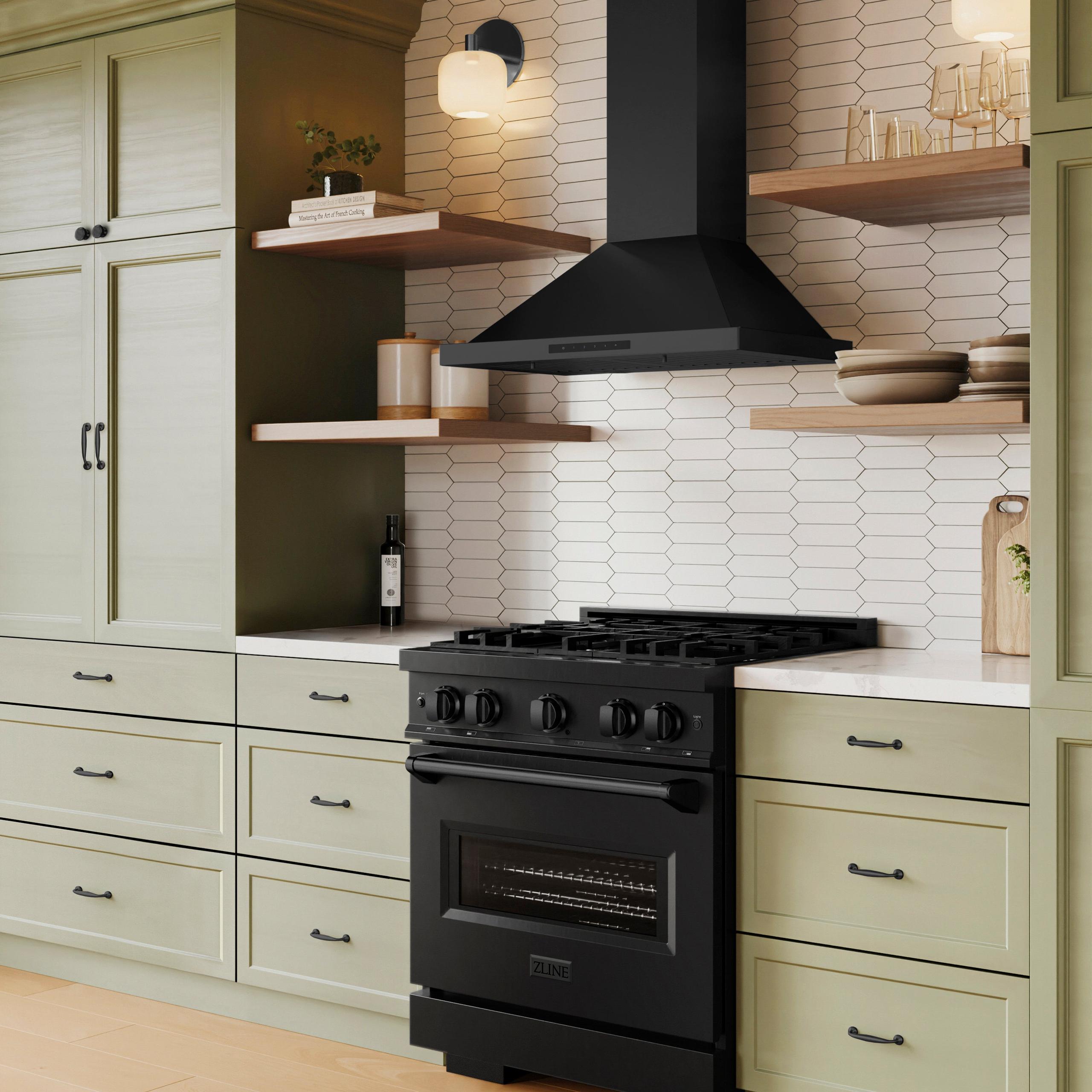 The ZLINE BSKBN-30 is a 30 in. professional wall mount stainless steel range hood with a modern design and built-to-last quality, making it a great addition to any kitchen. This hood's high-performance, 400 CFM 4-speed motor will provide all the power you need to quietly and efficiently ventilate your stove while cooking. With its classic 430 grade black stainless steel, this range hood contains rust, temperature, and corrosion-resistant properties to ensure a durable vent hood that will last for years to come. Enjoy modern features, including built-in LED lighting for an illuminated culinary experience and dishwasher-safe stainless steel baffle filters for easy clean-up. This wall mount range hood has a convertible vent, so you can have a luxury range hood whether you need a ducted or ductless option. Enjoy easy installation and an easy recirculating conversion process. ZLINE Kitchen and Bath stands by all products with its manufacturer parts warranty. The BSKBN-30 ships next business day when in stock.