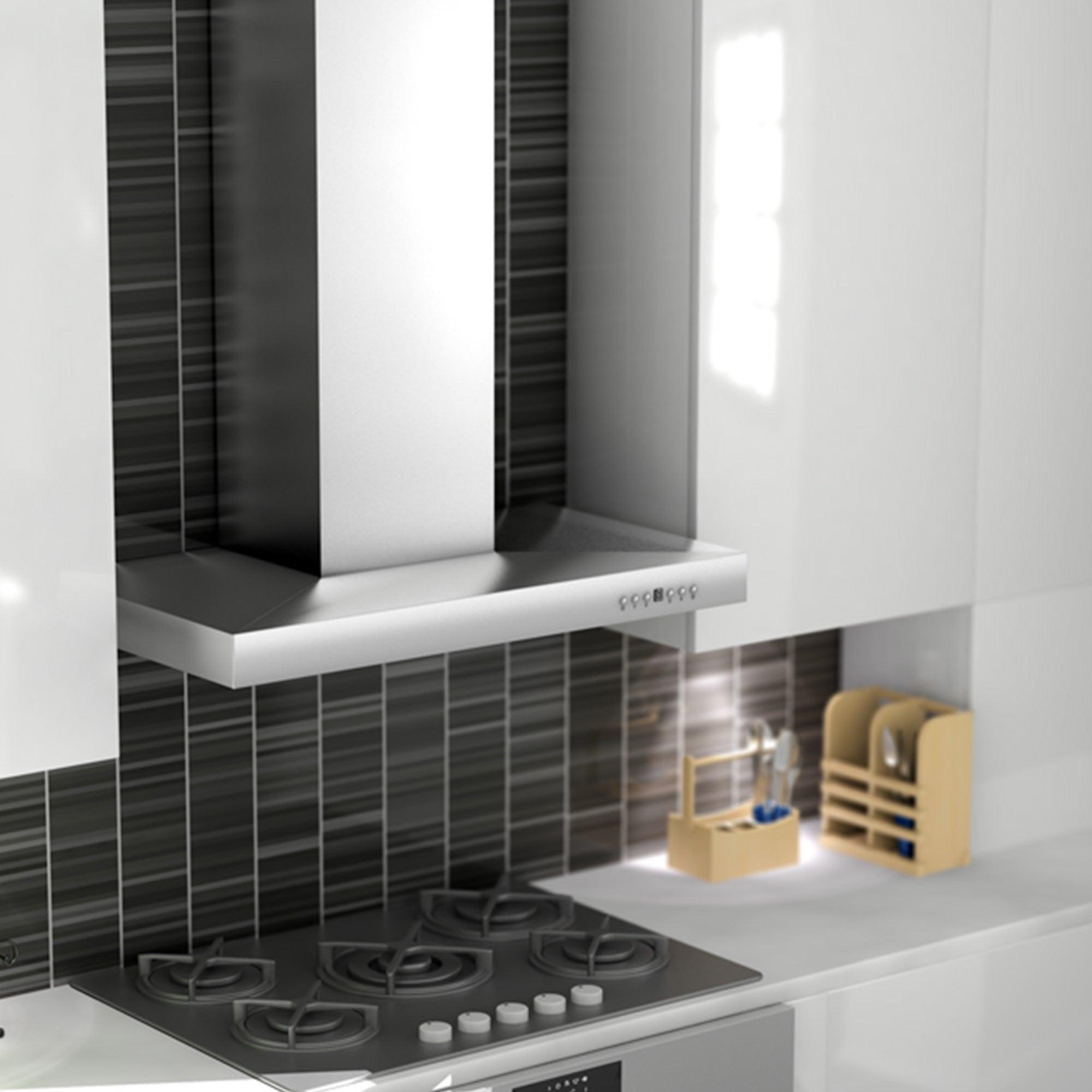 The ZLINE KECRN-42 is a 42 in. professional wall mount stainless steel range hood with a modern design and built-to-last quality, making it a great addition to any kitchen. This hood's high-performance, 400 CFM 4-speed motor will provide all the power you need to quietly and efficiently ventilate your stove while cooking. With its classic 430 grade stainless steel, this range hood contains rust, temperature, and corrosion-resistant properties to ensure a durable vent hood that will last for years to come. Enjoy modern features, including built-in LED lighting for an illuminated culinary experience and dishwasher-safe stainless steel baffle filters for easy clean-up. This wall mount range hood has a convertible vent, so you can have a luxury range hood whether you need a ducted or ductless option. Enjoy easy installation and an easy recirculating conversion process. ZLINE Kitchen and Bath stands by all products with its manufacturer parts warranty. The KECRN-42 ships next business day when in stock.