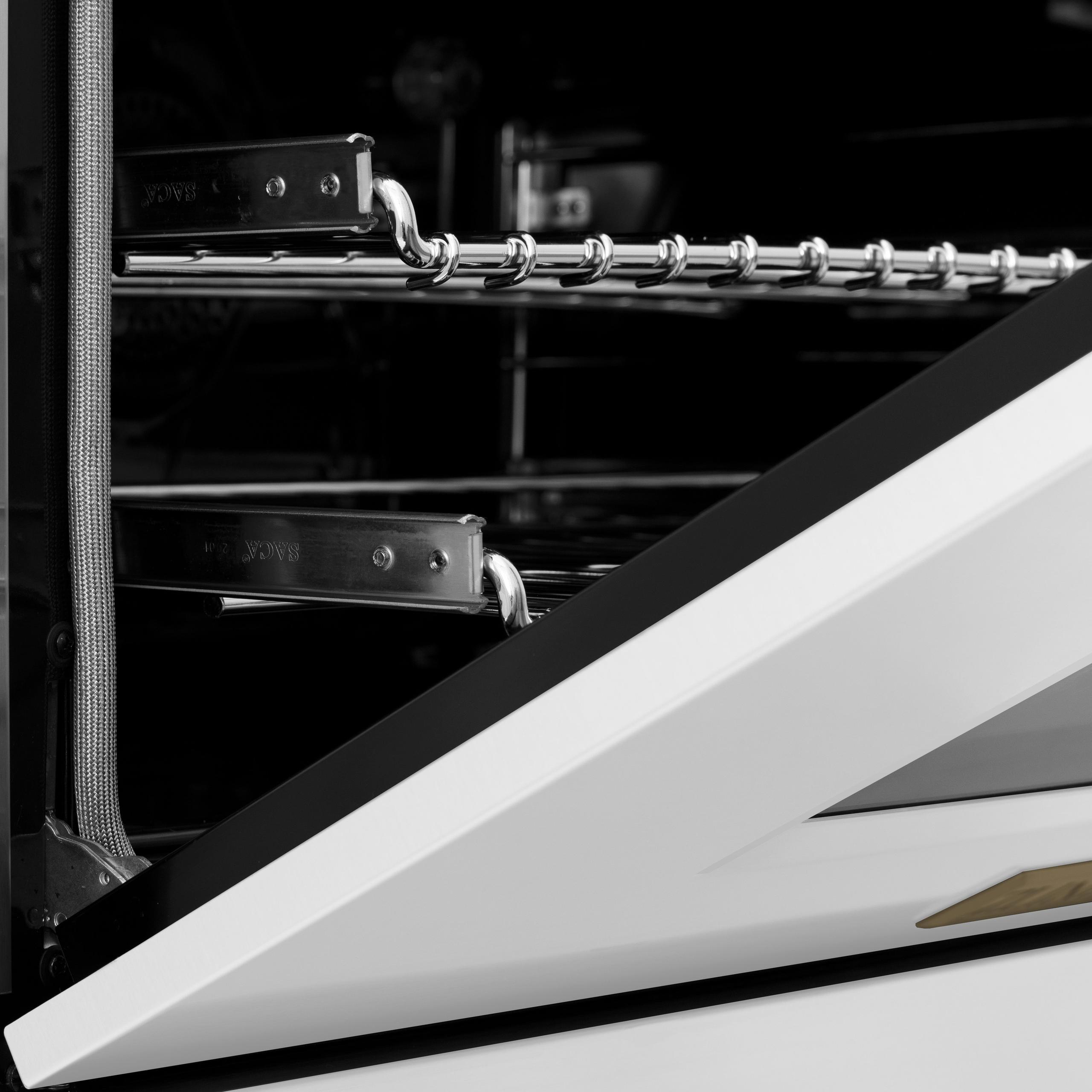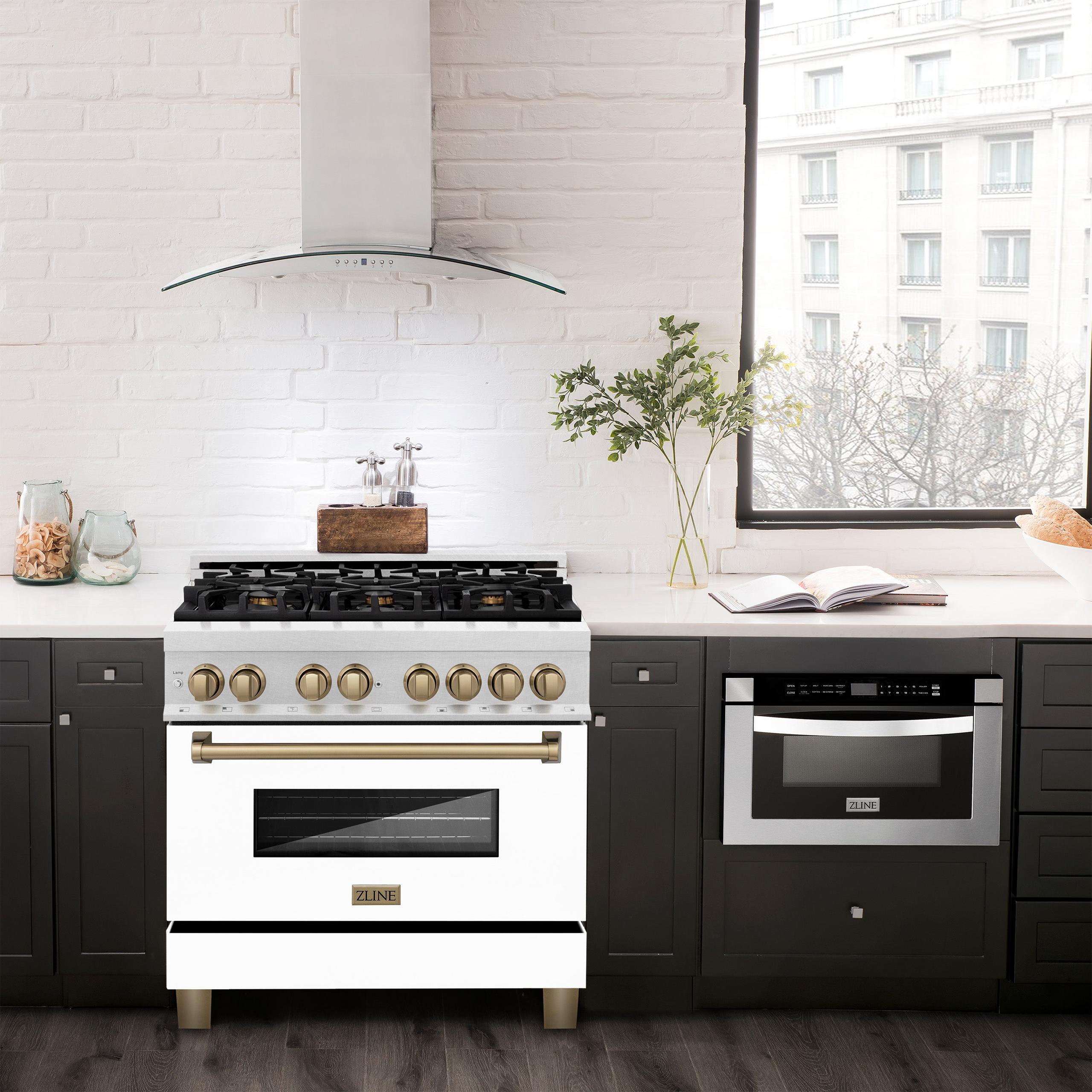 Luxury isn't meant to be left desired ? it's meant to be attainable. The ZLINE Autograph Edition 36 in. 4.6 cu. ft. Legacy Dual Fuel Range with 6 Burner Gas Cooktop and Electric Convection Oven in Satin Stainless Steel with White Matte Door and Champagne Bronze Accents (RASZ-WM-36-CB) pairs a powerful gas cooktop with 6 Italian-crafted burners, an electric convection oven, a beautiful white matte door with a Landscape window design, and elegant champagne bronze knobs and handle. With innovative features designed to enhance your kitchen's capability, ZLINE Legacy Dual Fuel Ranges provide a professional culinary experience by pairing unmatched performance with timeless style.