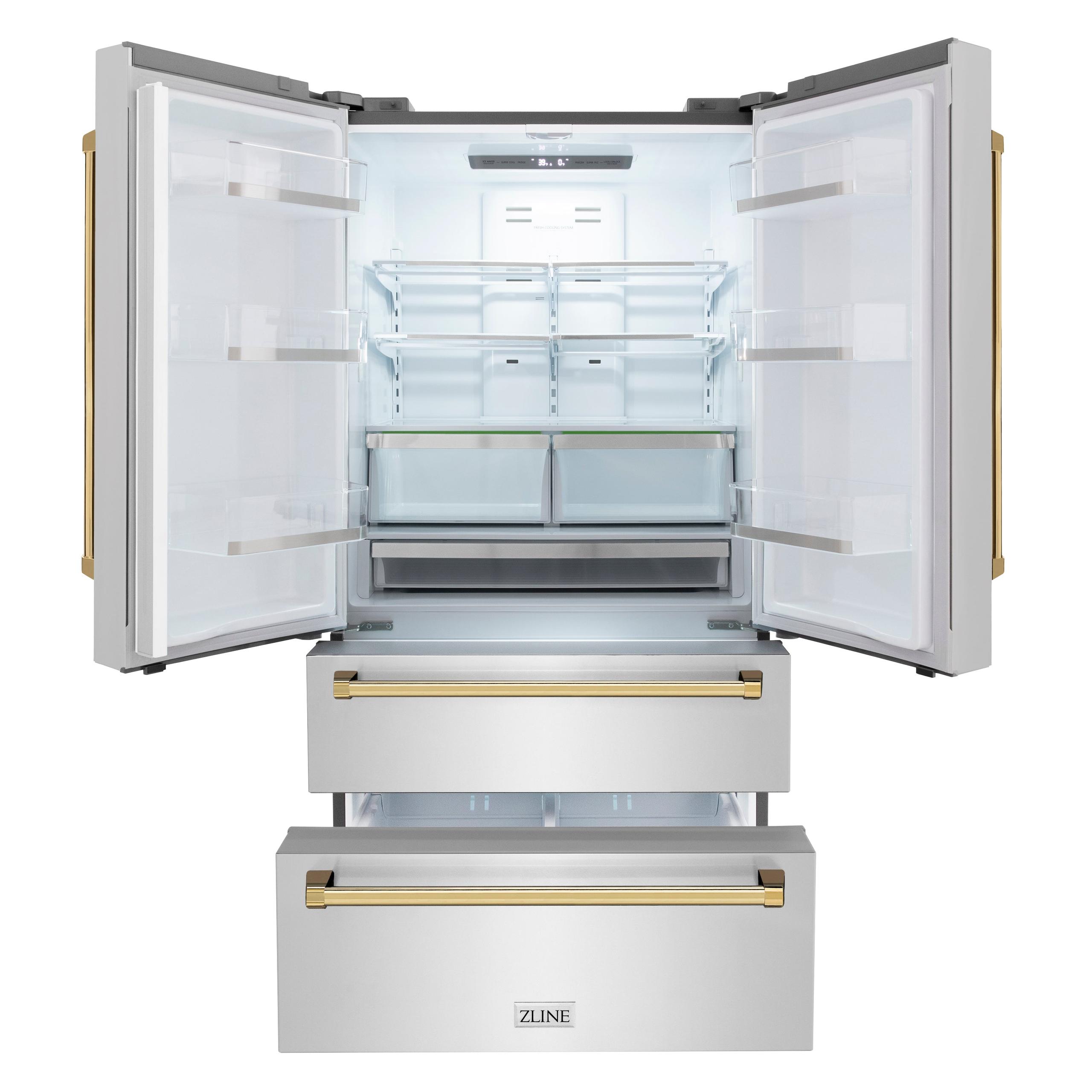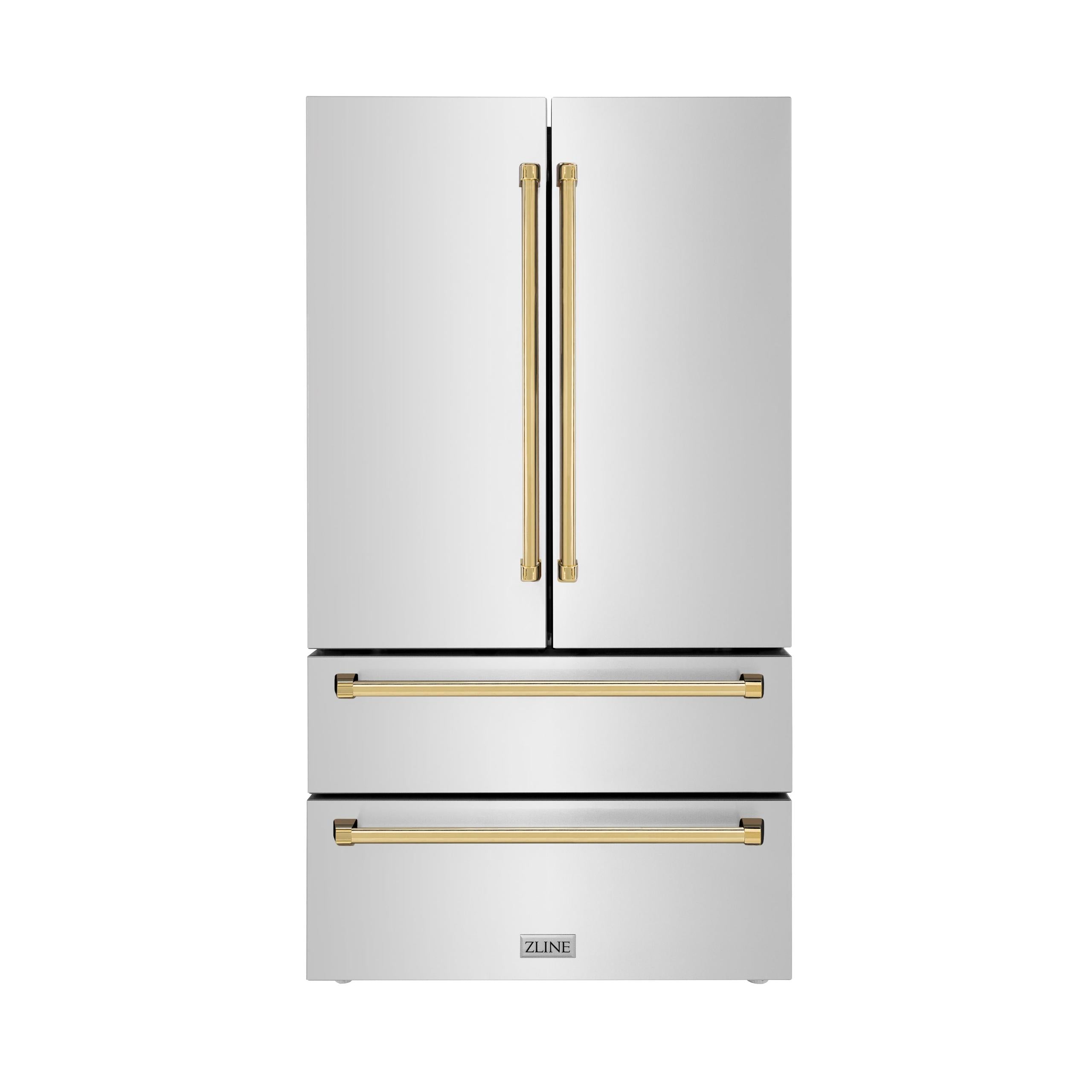 ZLINE KITCHEN AND BATH RFMZ36CB ZLINE Autograph Edition 36 in. 22.5 cu. ft. Counter-Depth French Door Refrigerator with Ice Maker in Fingerprint-Resistant in Stainless Steel with Champagne Bronze Traditional Handles (RFMZ-36-CB) Bronze
