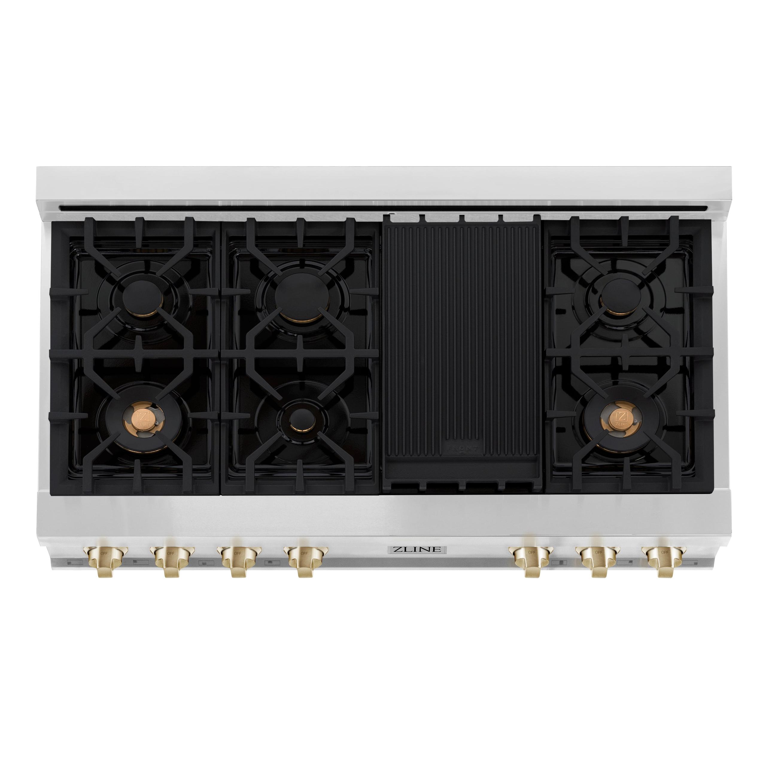 Luxury isn't meant to be desired - it's meant to be attainable. The ZLINE Autograph Edition 48 in. Legacy Gas Rangetop with 7 Burners and Porcelain Cooktop in Stainless Steel with Polished Gold Accents (RTZ-48-G) pairs a powerful gas cooktop with 7 Italian-crafted burners, a hand-crafted porcelain cooktop, and elegant polished gold knobs. With innovative features designed to enhance your kitchen's capability, ZLINE Legacy Rangetops provide a professional culinary experience by pairing unmatched performance with timeless style.