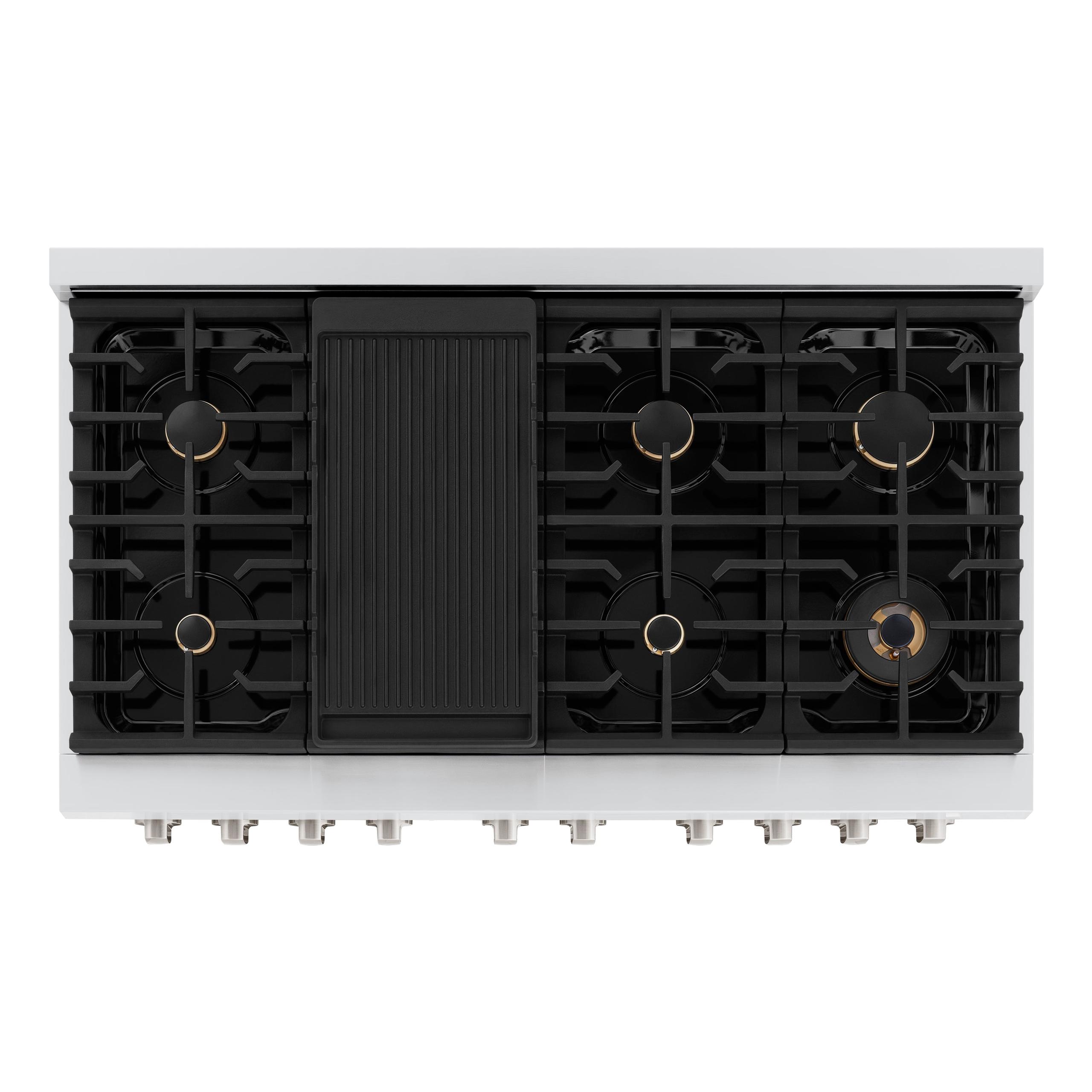 - Brass Burner Cooktop - Outfit your ZLINE 48 in. Paramount, Select, or Classic Series gas or dual fuel range with 6 high-quality brass burners to complement the 2 existing brass Dual Function Burners on the cooktop